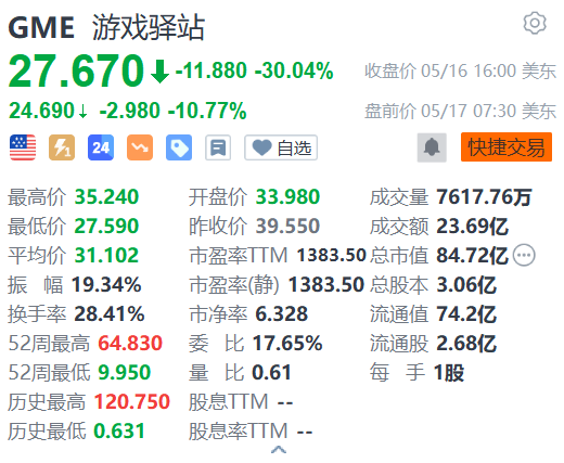 格隆汇5月17日|游戏驿站(GME.US)盘前跌逾10%,此前公司公布第一季度初步业绩,期内净亏损2700万至3700万美元;初步净销售额8.72亿至8.92亿美元,去年同期为12.37亿美元。