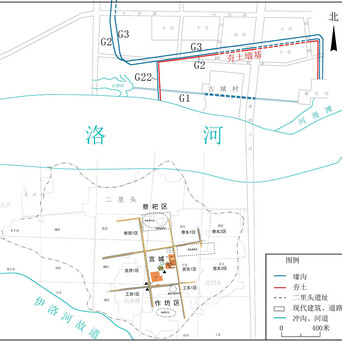 其中,G2、G3、夯土墙大致平行,均位于古城村遗址东、北部。已发现的部分均呈拐尺形,均包括西南-东北走向和南北走向的部分。西南-东北走向部分长度超过1800米,南北走向部分长度超过300米。